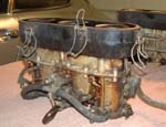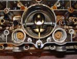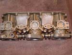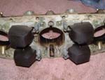 Top half of carb removed showing dirty float cambers. The accelerator pump injectors can be removed at this point. They are a tight fit so pull directly upwards and they will let go eventually!