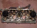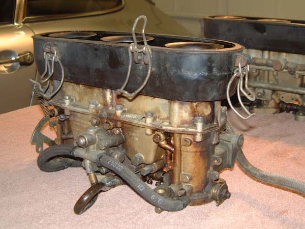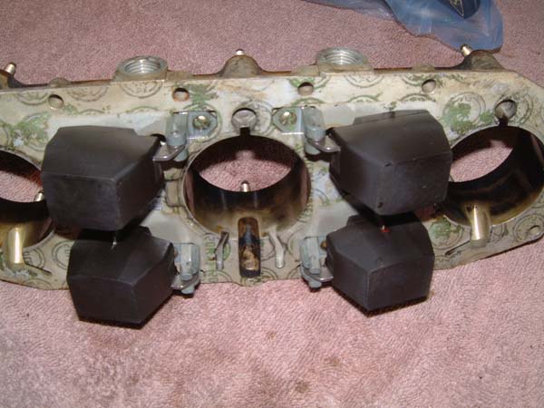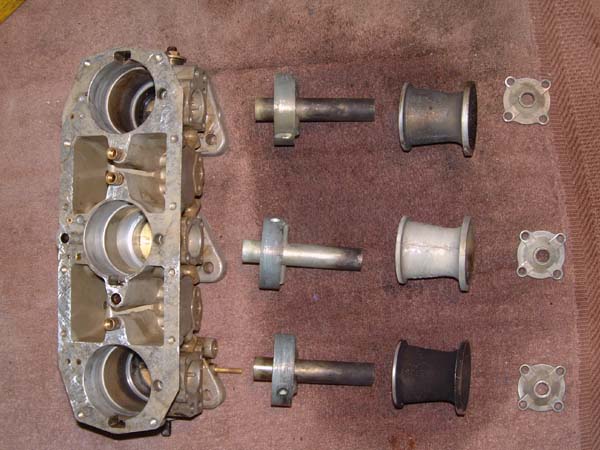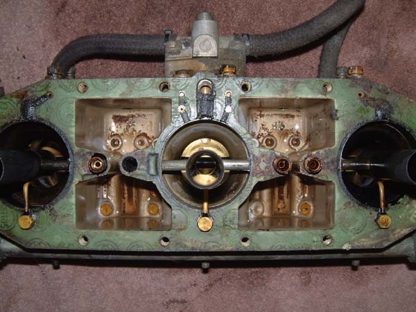 Top half of carb removed showing dirty float cambers. The accelerator pump injectors can be removed at this point. They are a tight fit so pull directly upwards and they will let go eventually!